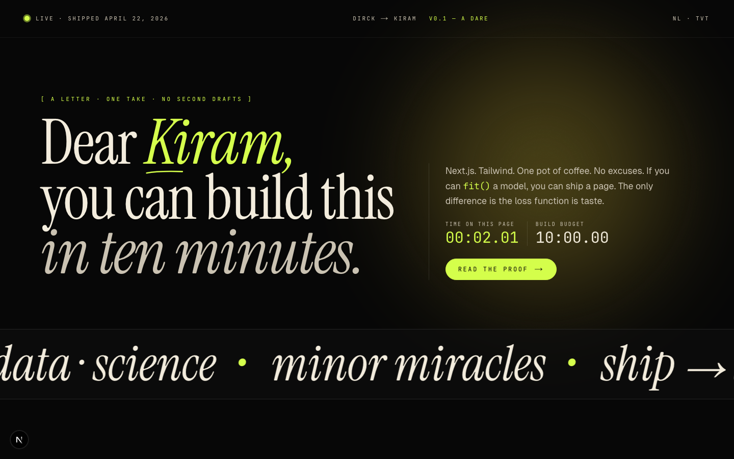 Hiram needed a website. Not a placeholder, not a coming-soon page, but an actual site he could share with people. He assumed this would take days of back-and-forth, wireframes, revisions, and the usual grind. I told him I could ship it before his coffee got cold.